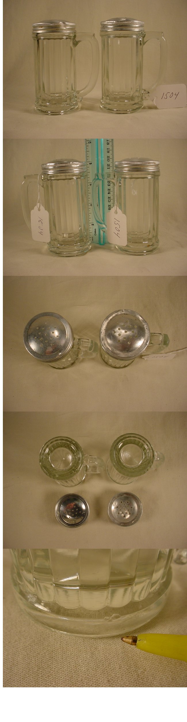 $30.00 (plus $8.00 shipping) Mission Mug Style Salt & Pepper A nice matching set around 4" tall that have original lids which screw on and off easily but do have some minor denting and one small flea bite on the lower rim. |