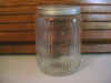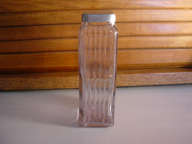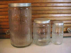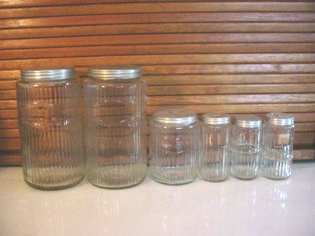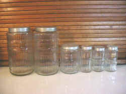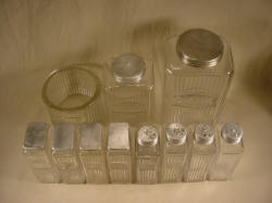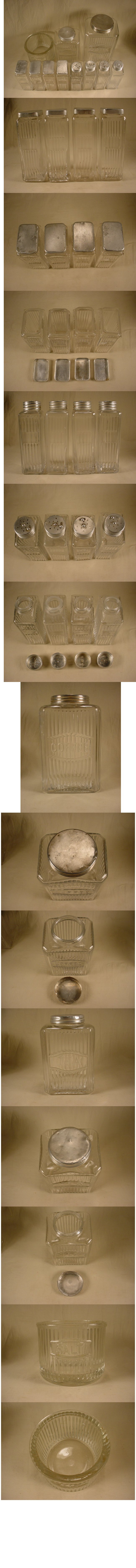 Early Rectangular Mission Complete Set This is a complete 11 piece set of Early Rectangular Mission Style Glassware. This glassware was used in Hoosier Cabinets that were produced right around 1912. It is a very difficult set to find because it was used for such a short time period. These jars all have their original lids and are in very good shape for being almost 100 years old. These jars were quickly and cheaply made so there are always some imperfections in the glass itself. All of the lips on these jars were ground at the factory when they were made. The only things to report are a small chip that does not go through to the interior on the back lower right corner of one of the button top (round lid) spice jars, some roughness and discoloration around the top rim of the salt box, and the threads on the coffee lid are worn so that although it will tighten, it will rotate past the point where it should tighten and stop. |