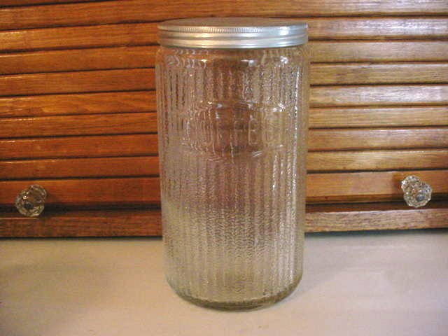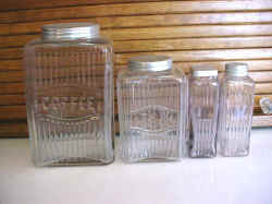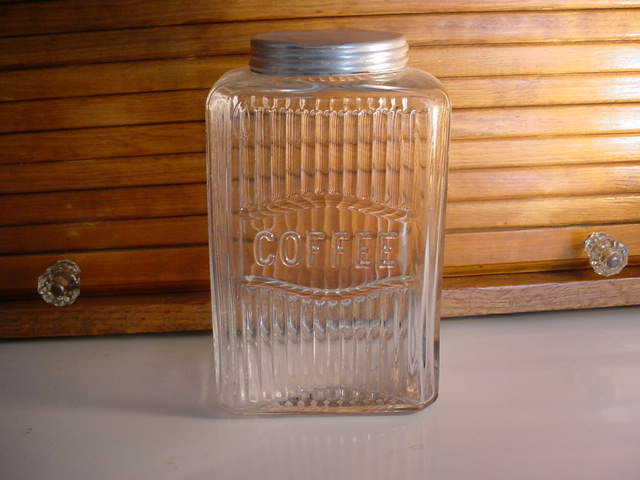 Mission style canisters would have to be the second most widely distributed style of canister. Rectangular mission was one of the earliest glass sets produced for Hoosier Cabinets. These were only used for a short period of time and so are very scarce today. The later Mission canisters were produced with either an embossed label (coffee, tea, salt or blank) or the labels were acid etched onto the glass.