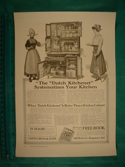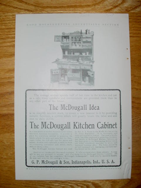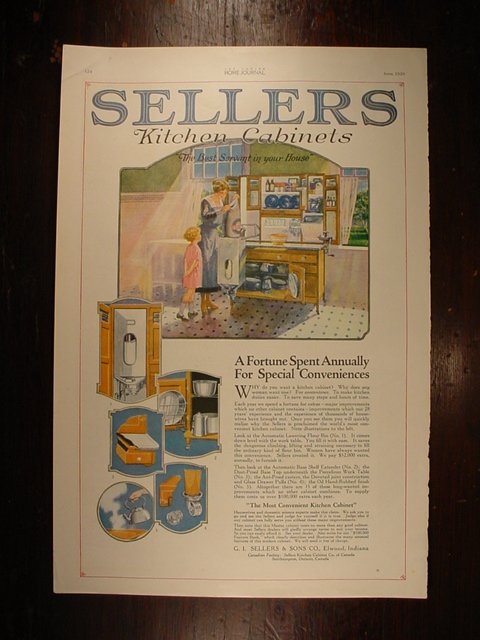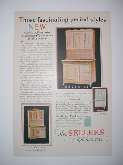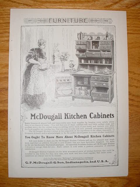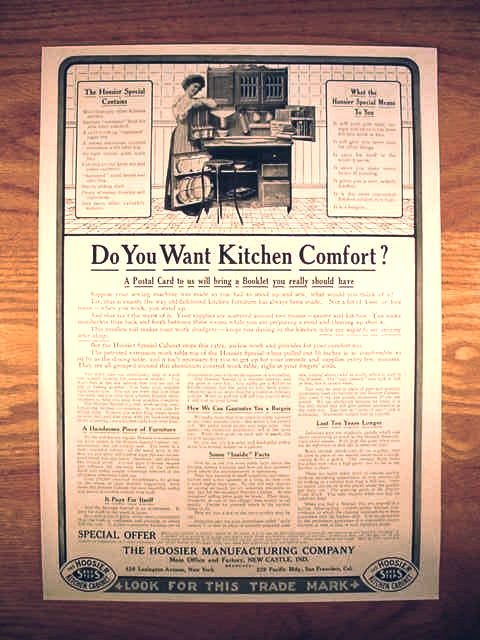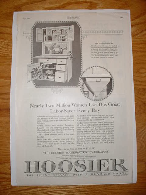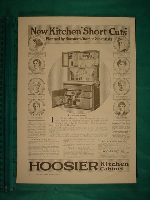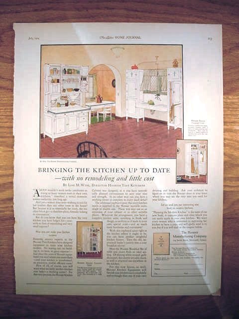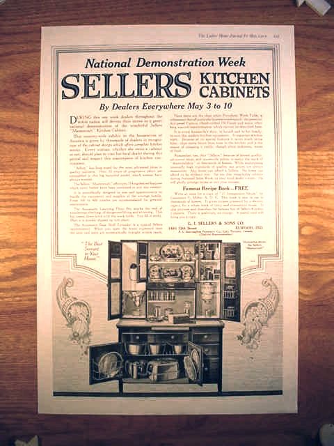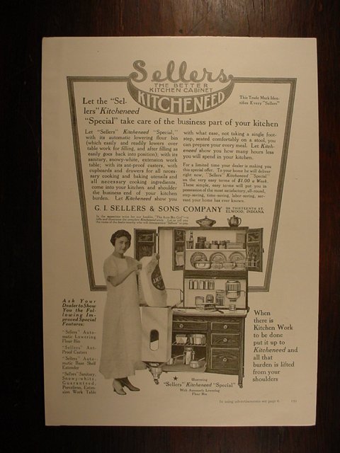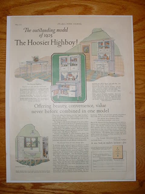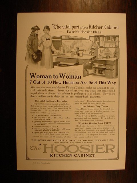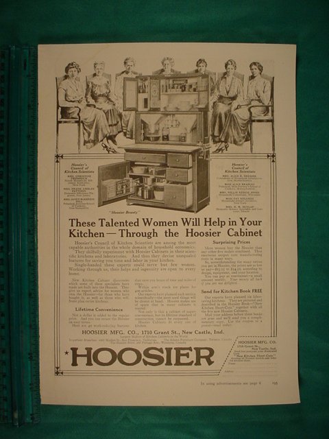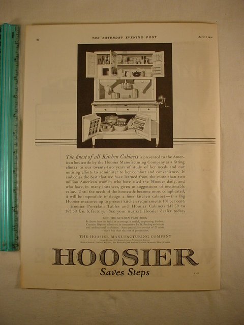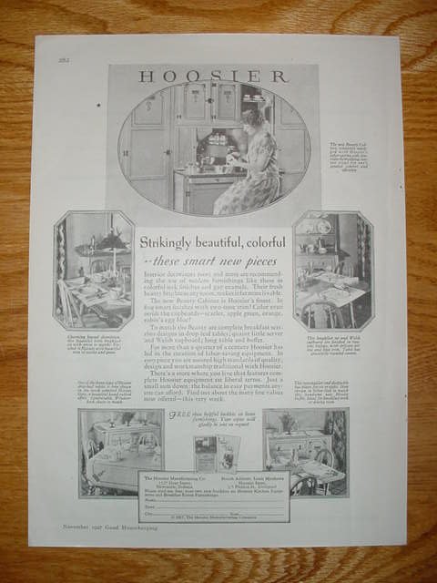 Original Advertisements for "Hoosier" Cabinets This page contains original advertisements removed from period magazines for many different makes and models of "Hoosier" style cabinets. We sell only original advertisements (no copies or reproductions) that are ready to be trimmed, matted and framed. Original ad's are usually the best way of determining what style of glassware and other accessories your cabinet was equipped with when it was new. Shipping cost will be $3.00 via First Class Mail for any number of ads. |
